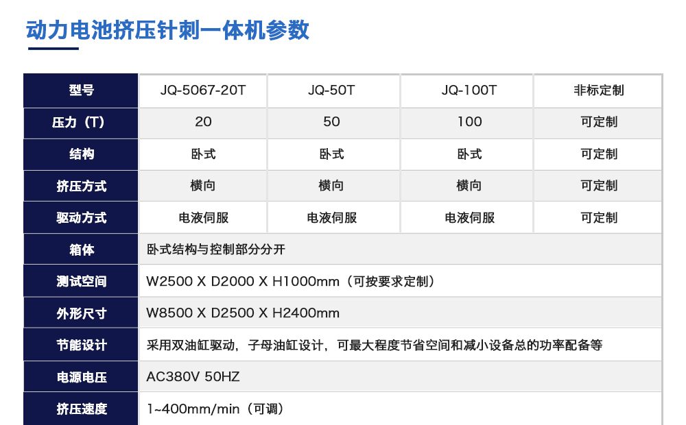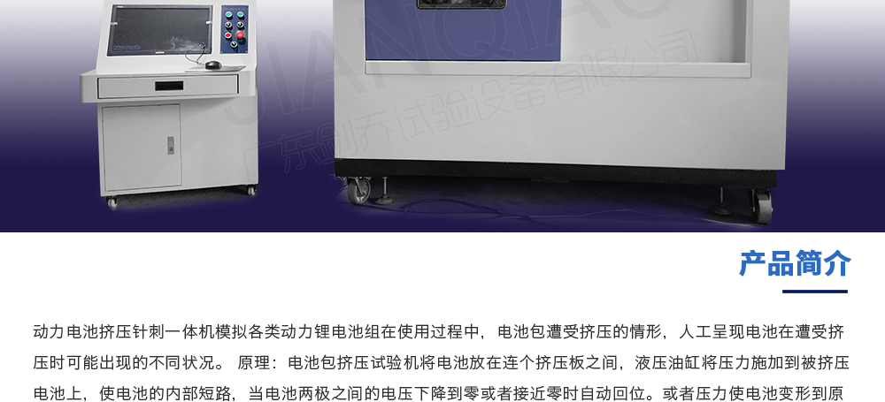 用途:動力電池?cái)D壓針刺一體機(jī)模擬各類動力鋰電池組在使用過程中,電池包遭受擠壓的情形,人工呈現(xiàn)電池在遭受擠壓時(shí)可能出現(xiàn)的不同狀況。 原理:電池包擠壓試驗(yàn)機(jī)將電池放在連個(gè)擠壓
