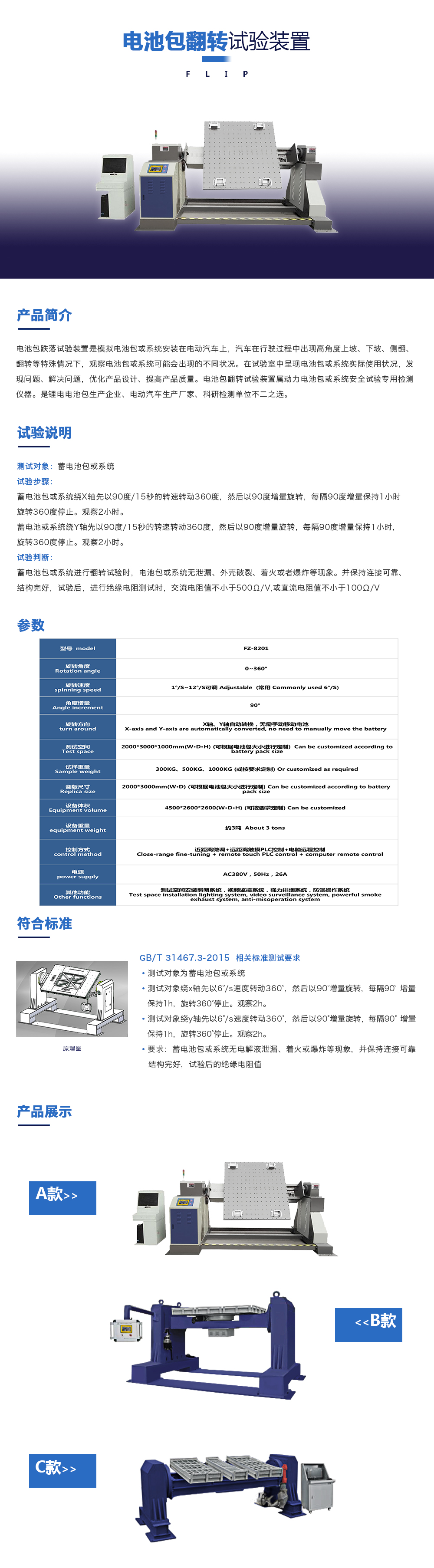 用途:電池包翻轉(zhuǎn)試驗(yàn)臺是模擬電池包或系統(tǒng)安裝在電動汽車上,汽車在行駛過程中出現(xiàn)高角度上坡、下坡、側(cè)翻、翻轉(zhuǎn)等特殊情況下,觀察電池包或系統(tǒng)可能會出現(xiàn)的不同狀況。在試驗(yàn)室中
