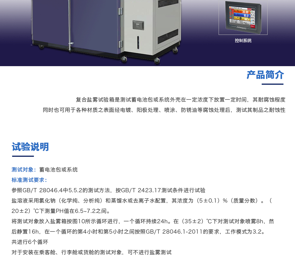 用途:復(fù)合鹽霧試驗(yàn)箱是測試蓄電池包或系統(tǒng)外殼在一定濃度下放置一定時(shí)間,其耐腐蝕程度同時(shí)也可用于各種材質(zhì)之表面經(jīng)電鍍、陽極處理、噴涂、防銹油等腐蝕處理后,測試其制品之耐蝕