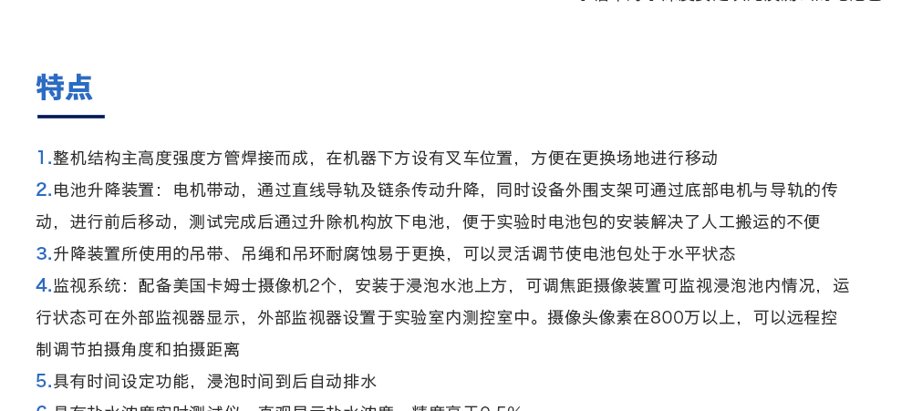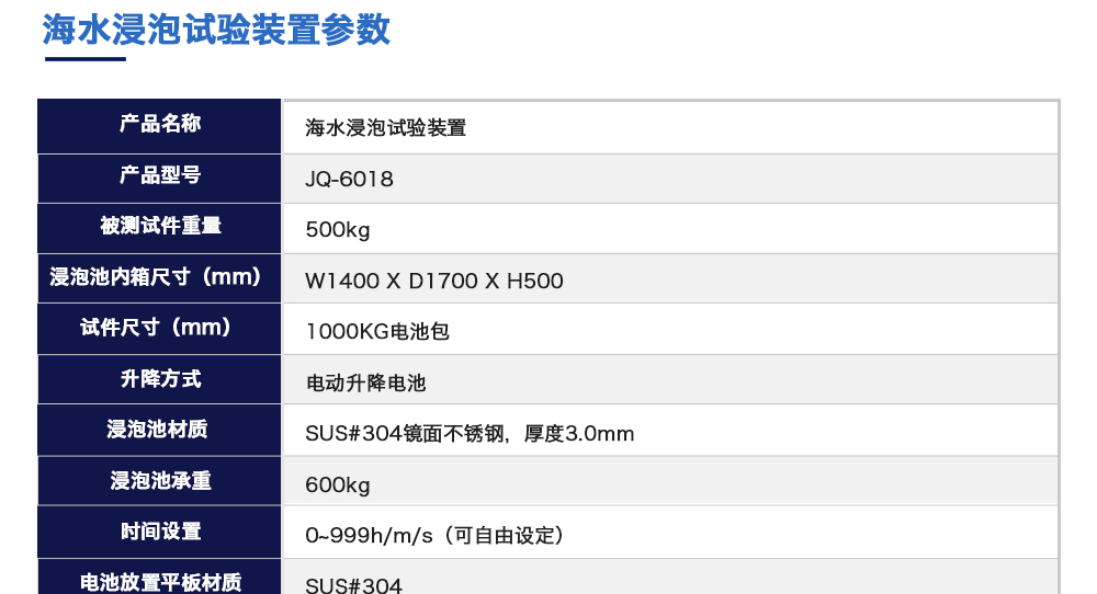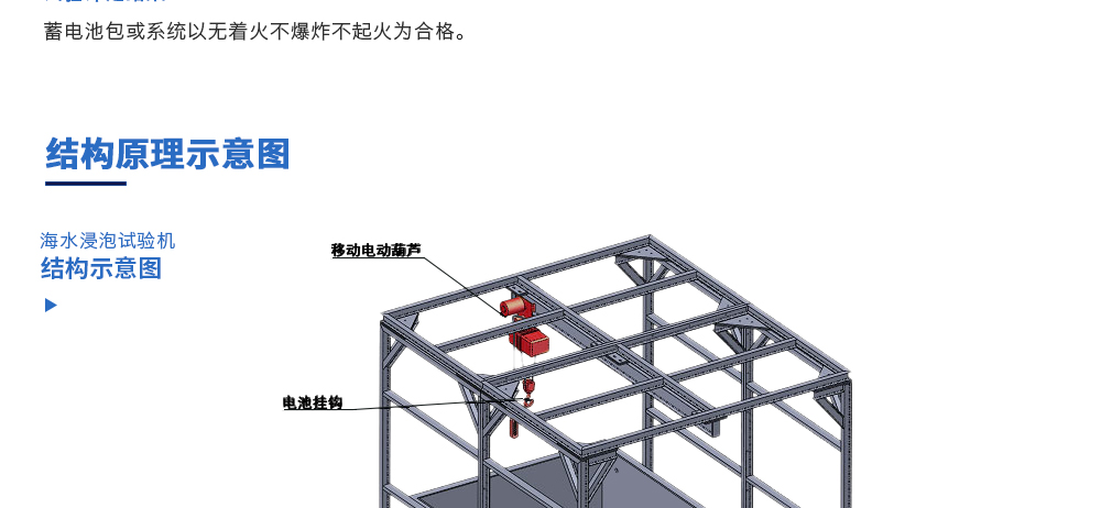 用途:海水浸泡試驗裝置主要用于電池以實車裝配狀態與整車線束相連然后以實車裝配方向在常溫下的海水成分中浸泡2h(海水為模擬海水成分,濃度為3.5%NaCl溶液)水槽中海水深度要足以淹