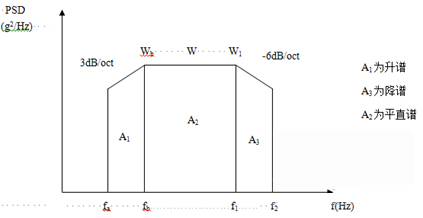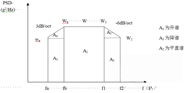 為了簡(jiǎn)便起見(jiàn),往往將功率譜密度曲線圖劃分成若干矩形和三角形,并利用上升斜率(如3dB/oct)和下降斜率(如-6dB/oct)分別算出wa 和w2,然后求各個(gè)幾何形狀的面積與面積和,再開(kāi)方求出加速度總均方根值。