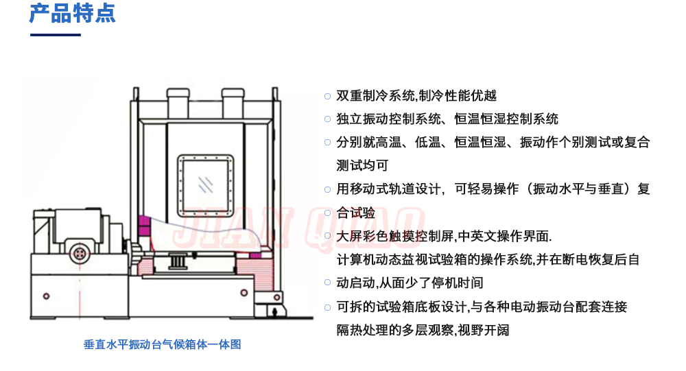用途:垂直+水平振動高低溫三綜合箱(JQTHV-500):主要是試驗箱和振動試驗系統(tǒng)的綜合,試驗時將溫度、濕度、振動(高溫或低溫),(正弦振動或隨機振動)以及電應(yīng)力按規(guī)定的周期綜合在同一氣候試驗箱中施加到樣品上進行溫度、濕度、振動的“環(huán)境仿真”試驗。