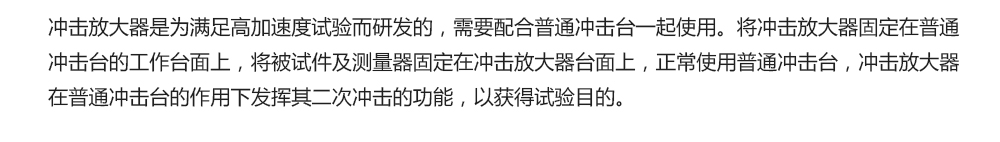 用途:沖擊放大器是為滿足高加速度試驗(yàn)而研發(fā)的,需要配合普通沖擊臺(tái)一起使用。